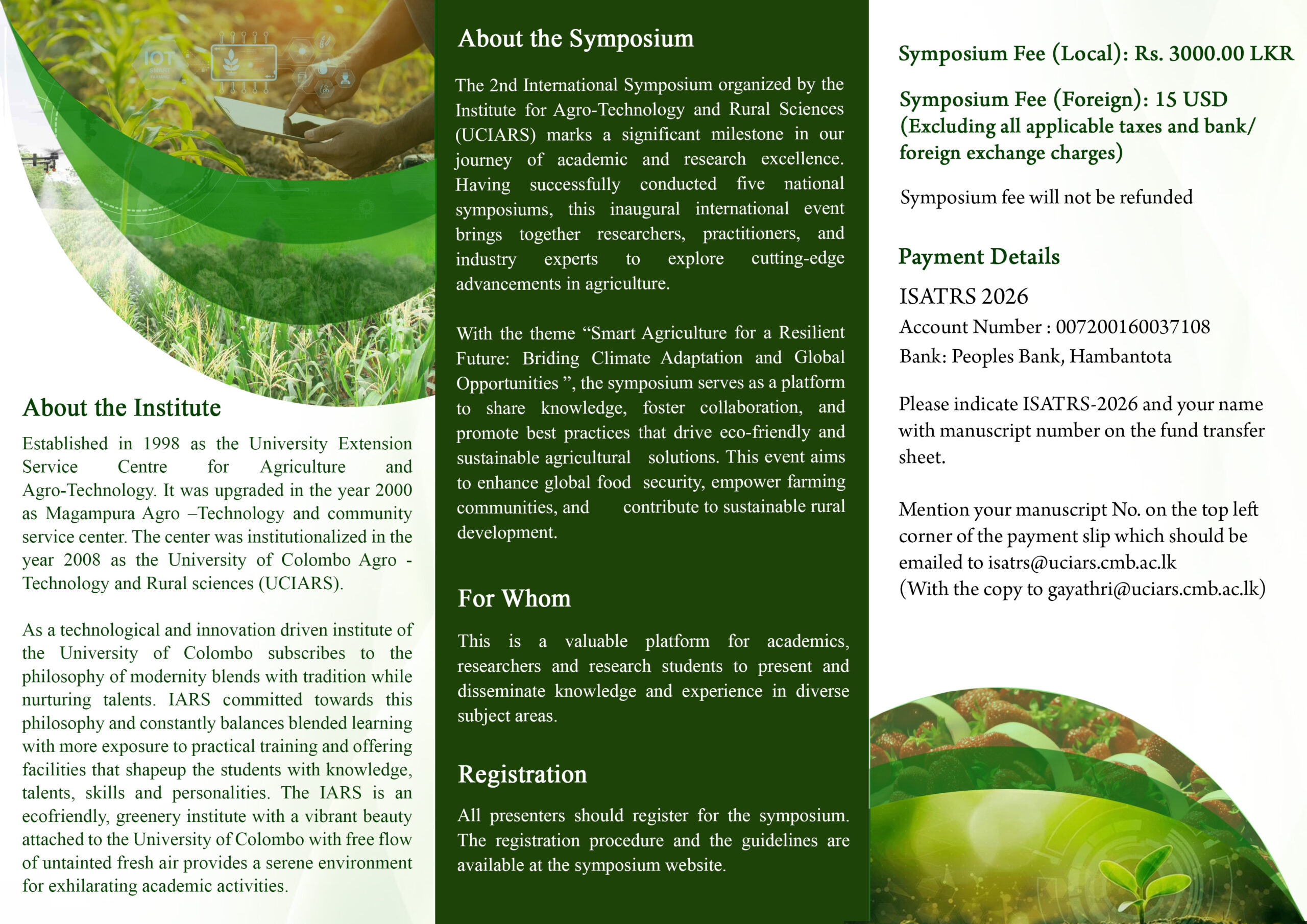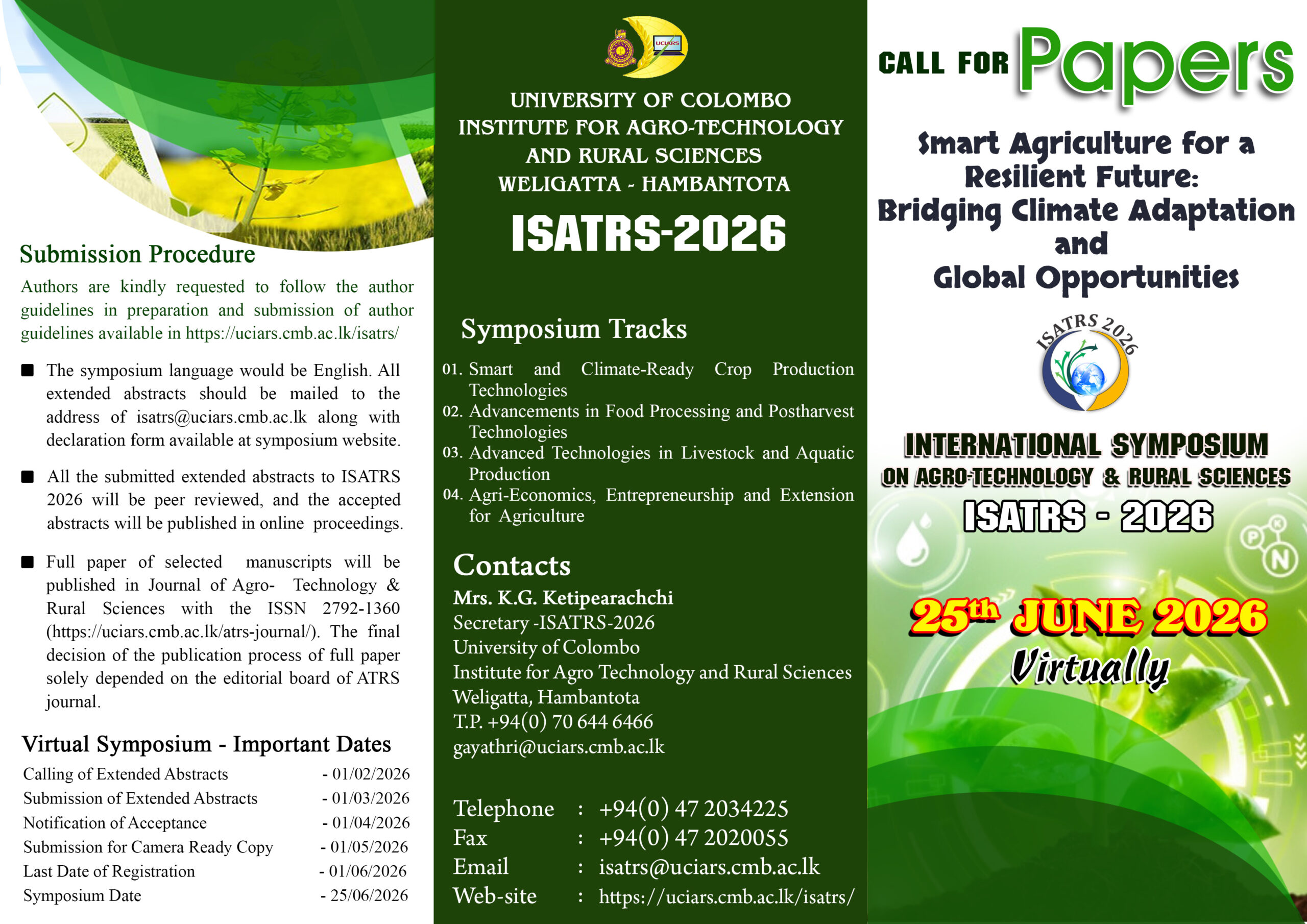 Welcome to the 2nd International Symposium (ISATRS 2026) of the University of Colombo Institute for Agro-Technology & Rural Sciences for harnessing the advancements in scientific knowledge for the improvement and better performance of the farming community and all kinds of stakeholders in the agricultural sector.